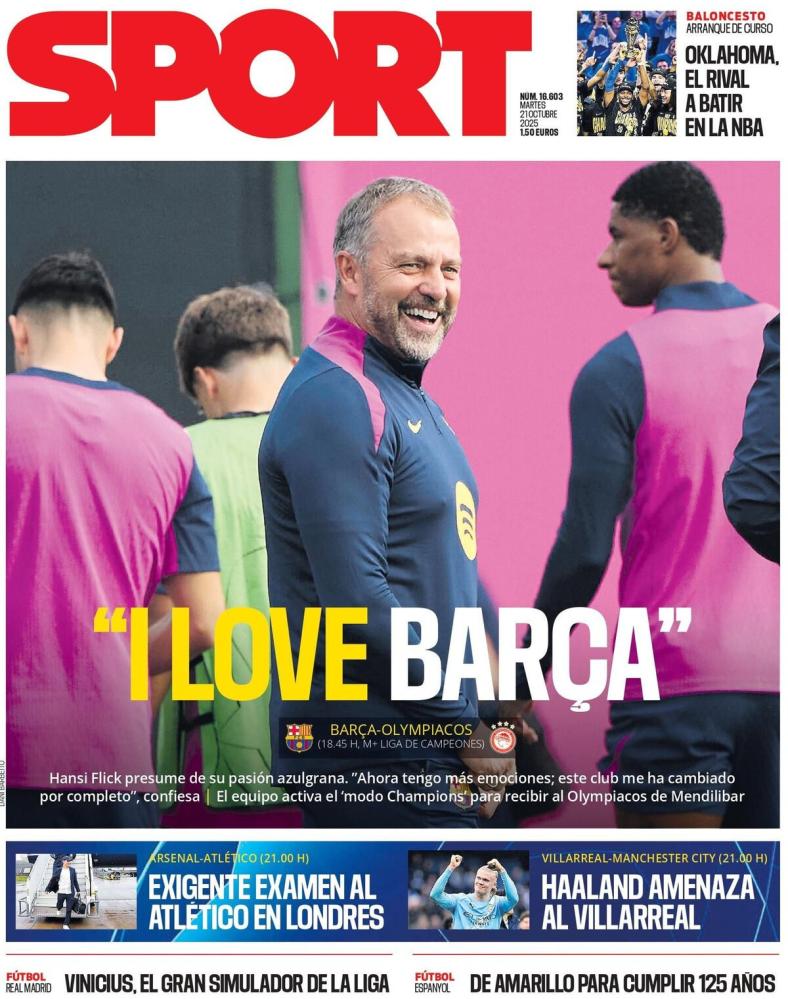 Sport apunta que "Hansi Flick presume de su pasión blaugrana. El equipo activa el 'modo Champions' para recibir al Olympiacos de Mendilibar". Espacio para los compromisos de Atlético y Villarreal CF.