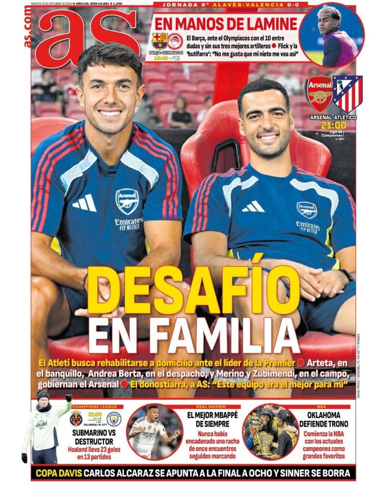 As publica que "el Atleti busca rehabilitarse a domicilio ante el líder de la Premier. Arteta, en el banquillo, Andrea Berta en el despacho, y Merino y Zubimendi en el campo, gobiernan al Arsenal".