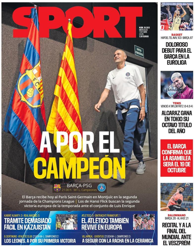 Sport apunta en su portada que "el Barça recibe hoy al Paris Saint-Germain en Montjuïc en la segunda jornada de la Champions League. Los de Hansi Flick buscan la segunda victoria europea de la temporada ante el conjunto de Luis Enrique".