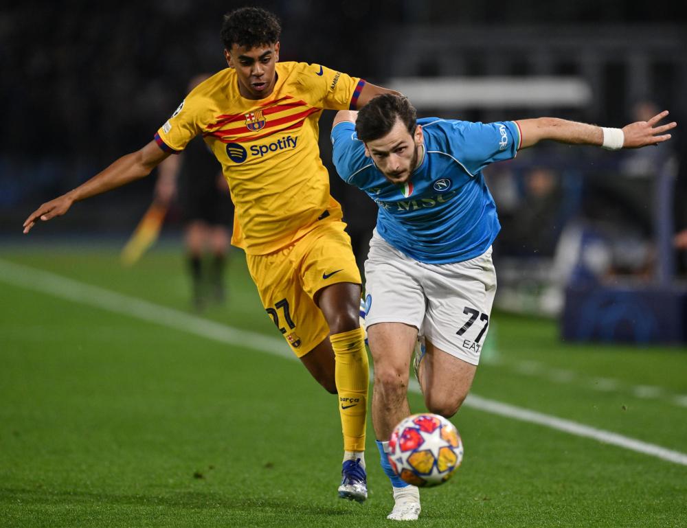Ci Napoli 21/02/2024 - Champions League / Napoli-Barcellona / foto Carmelo Imbesi/Image Sport nella foto: Khvicha Kvaratskhelia-Lamine Yamal