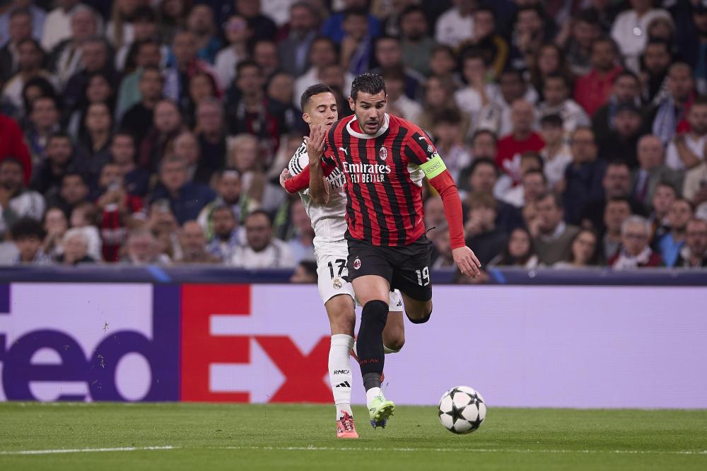 Madrid, UEFA Champions League 2024-2025, Real Madrid CF-AC Milan, giocata allo stadio Santiago Bernabeu. Nella foto: Theo Hernandez e Lucas Vazquez